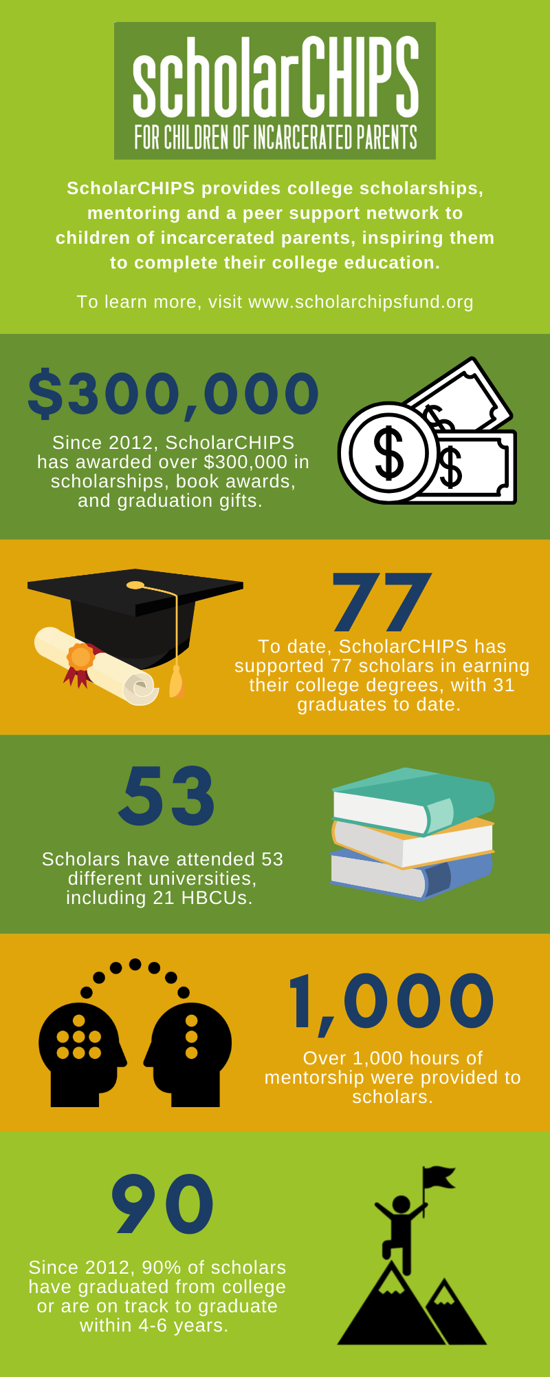 ScholarCHIPS’ goal is to empower youth with incarcerated parents to graduate college, establish upwardly mobile careers, and contribute to their communities. To date, ScholarCHIPS has served 77 scholars and has awarded over $300,000 in scholarships, book awards, and graduation gifts. ScholarCHIPS now has 32 graduates.